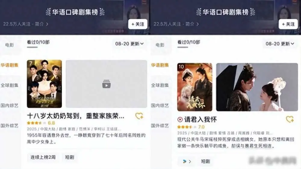 最近豆瓣华语剧集榜可热闹了,啥凡人修仙传、扫毒风暴这些大制作还在厮杀呢,突然杀出俩小短剧——《十八岁太奶奶驾到2》和《请君入我怀》,愣是挤进了前几名。这事搁两年前谁信啊?听花岛这公司2024年春节靠着《我在八零年代当后妈》才刚冒头,现在居然能和长剧掰手腕,确实有点意思。